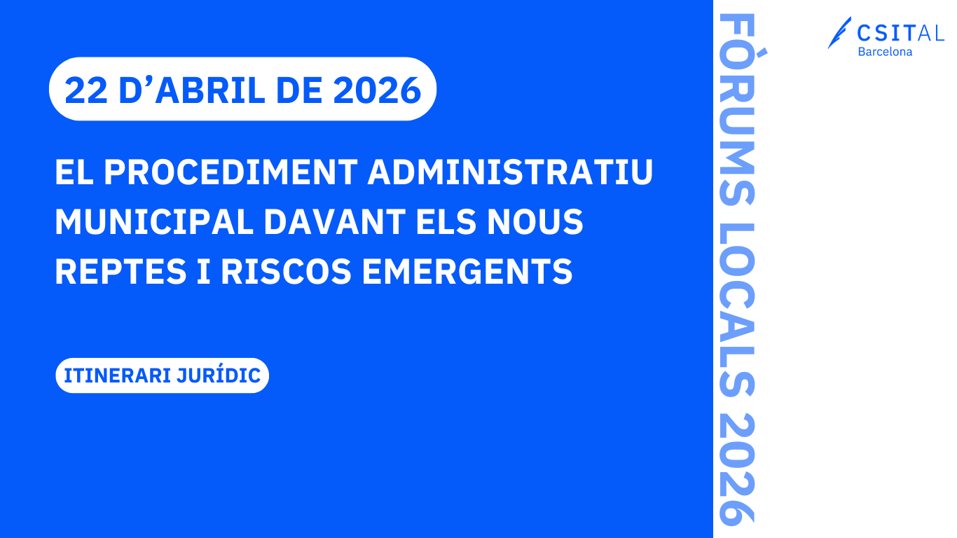 Coordinació: Carmen Alonso Higuera El CSITAL de Barcelona organitza el dimecres dia 22 d’abril de 2026 aquesta jornada, en format en línia a la plataforma Zoom. 📄 OBJECTIUS En conjunt, la jornada ofereix una visió integrada de com els municipis han d’enfortir la seva estructura jurídica i organitzativa per afrontar un entorn d’incertesa i risc,Continua llegint “EL PROCEDIMENT ADMINISTRATIU MUNICIPAL DAVANT ELS NOUS REPTES I RISCOS EMERGENTS”