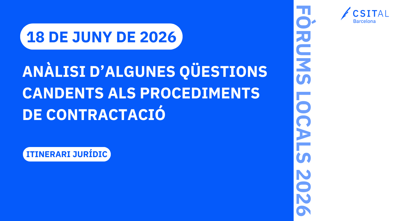 Coordinació: Carmen Alonso Higuera El CSITAL de Barcelona organitza el dijous dia 18 de juny de 2026 aquesta jornada, en format en línia a la plataforma Zoom. 📄 OBJECTIUS Anàlisi i valoració pràctica del règim jurídic del recurs especial en matèria de contractació a Catalunya, de les problemàtiques derivades de la regularització comptable de laContinua llegint “ANÀLISI D’ALGUNES QÜESTIONS CANDENTS ALS PROCEDIMENTS DE CONTRACTACIÓ”